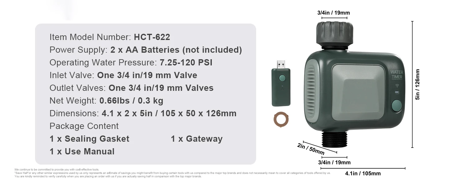 【Rain Delay Mode, IPX6 Waterproof】: Our Wi-Fi smart watering controller features a rain delay mode that helps you conserve water by postponing your schedule for 24/48/72 hours, ensuring your plants aren't overwatered during rainy periods. Experience leak-proof efficiency and water conservation with IPX6 waterproof rating. The built-in filter effectively filters sediment and particles from water, withstanding high water pressure from 7.25 psi to 120 psi.
