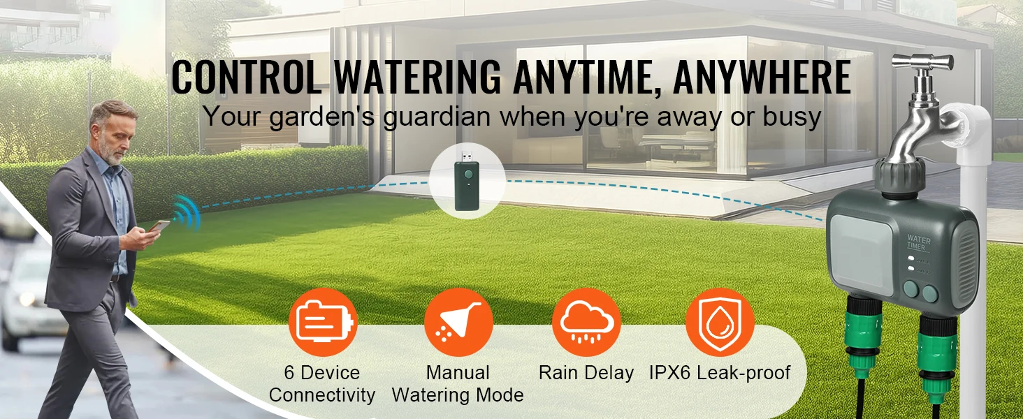 【5 Independent Watering Schedules】: Customize up to 5 unique watering schedules with our smart WiFi hose timer, offering versatile watering durations (1 minute to 24 hours) and frequencies (daily or specific days of the week). Whether it's hourly cycles or fixed-time watering, maintain precise irrigation to ensure your plants receive consistent care. Never worry about forgetting to water or insufficient hydration while away on vacation.