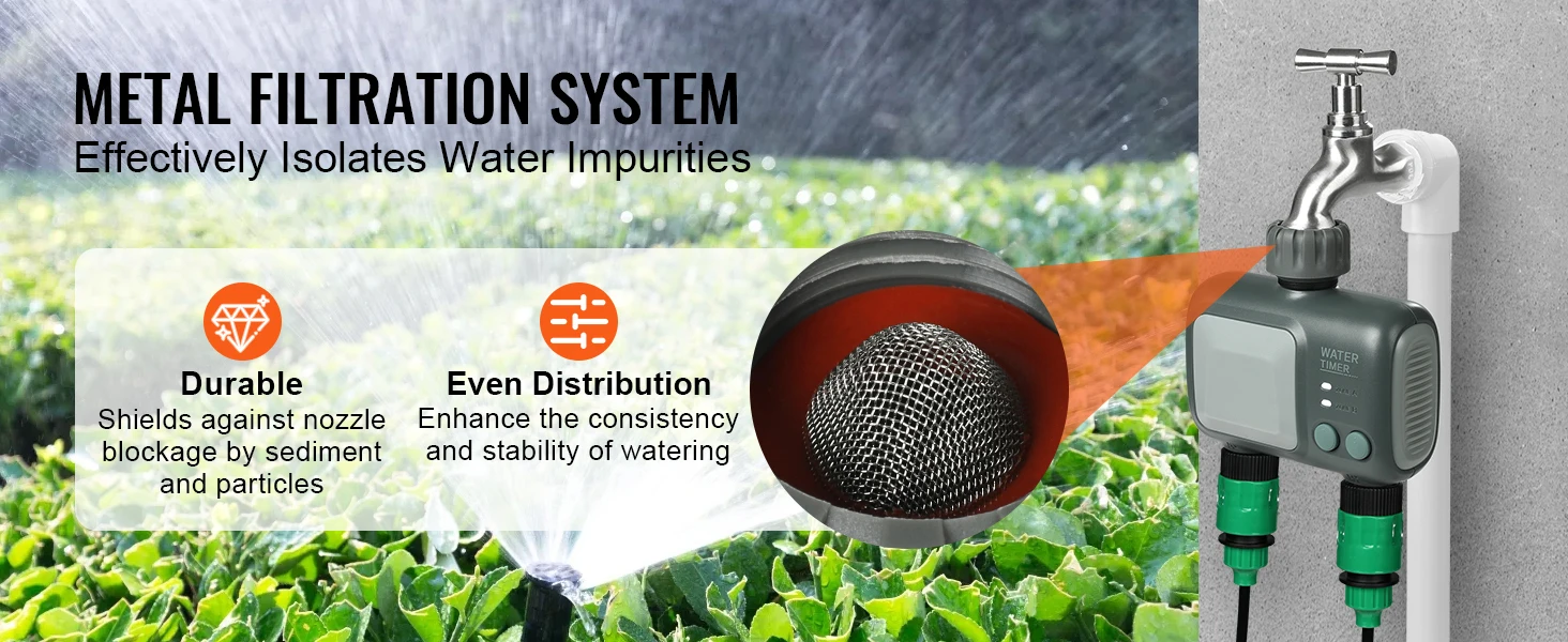 Our smart irrigation timer features a 360° rotating inlet port for easy installation. Its built-in filter effectively isolates sediment and particles from water, ensuring smooth water distribution. It handles water pressure up to 120 PSI and has an IPX6 waterproof rating and robust construction.